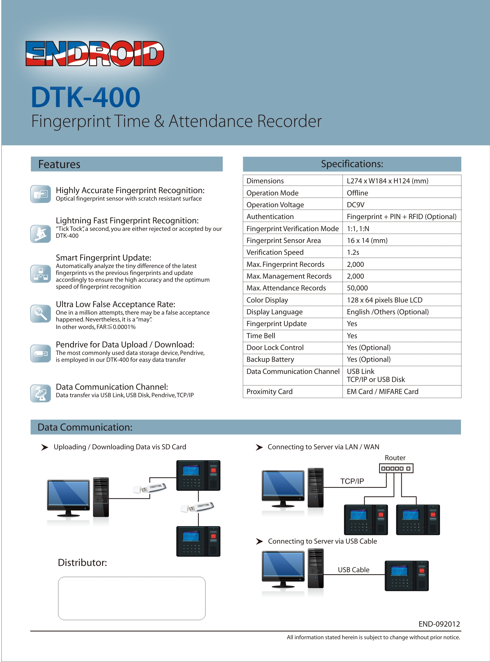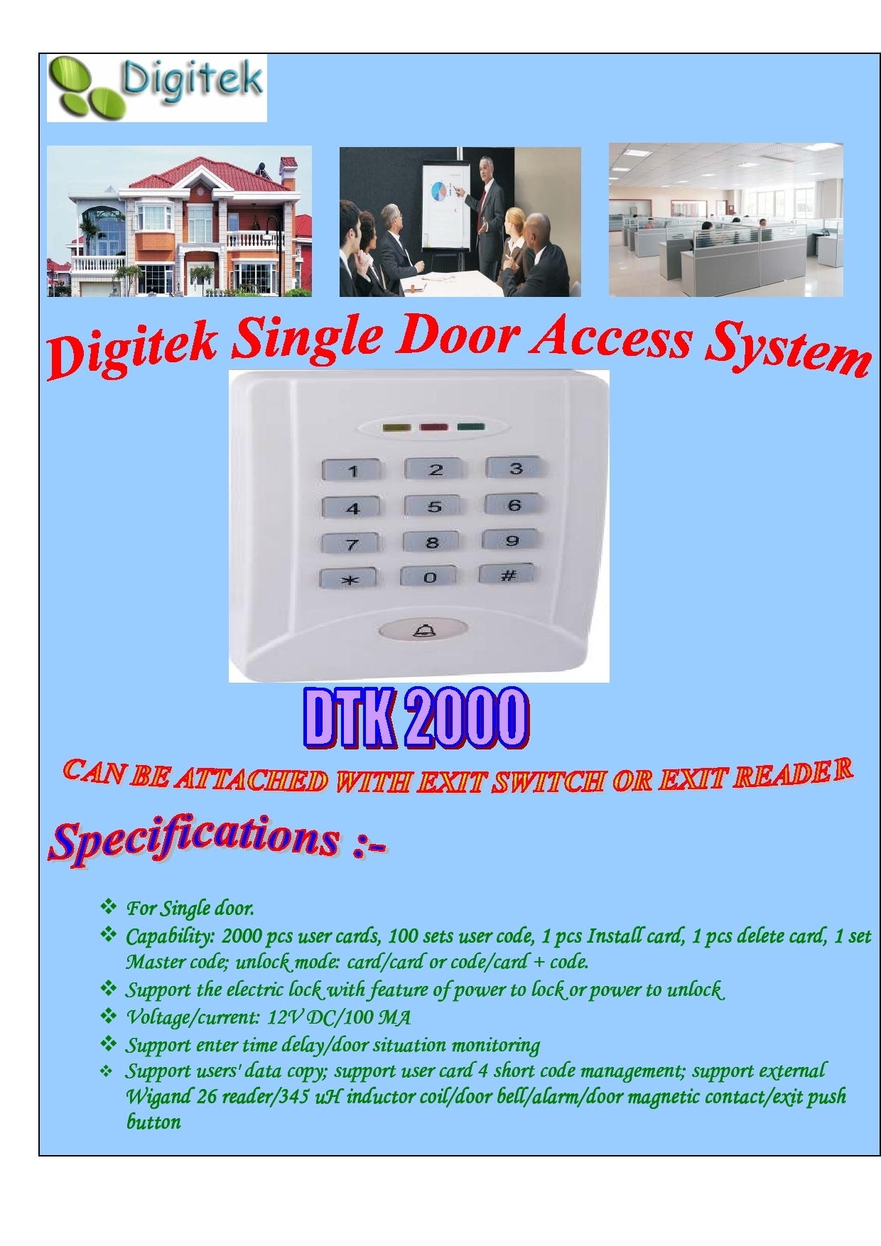 DTK 401 Record Transaction Capacity -1,00,000 Identification method - FP,PIN Optional - Card FP Capacity - 1,000 Power - 9 V DC Battery back up - Optional Access - (Optional & power controller with inbulit relay required) | |
