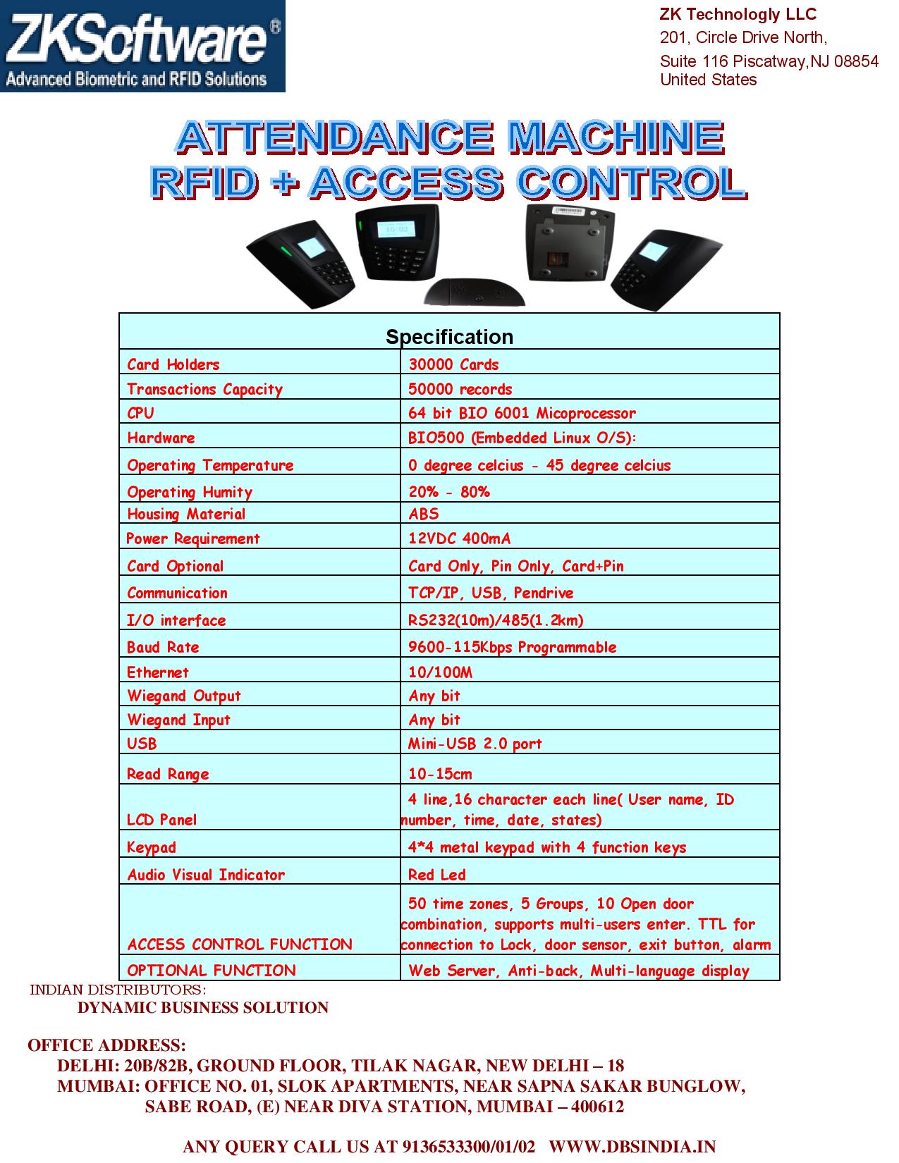 ZK WSC501 (Card + Dedicated access) Record capacity - 50,000 Card - 30,000 USB - For pendrive TCP/IP Connectivity 12V 1 AMP Adopter is not part of standard accessory